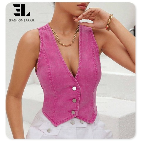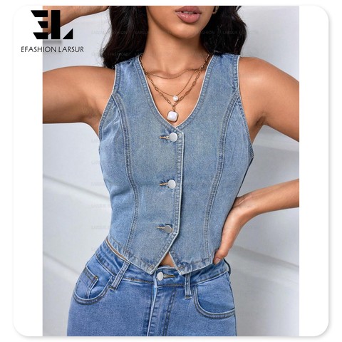 LARSUR fábrica personalizada señoras Chaleco de mezclilla flaco botón Fly bustier Denim Halter Tank Top jeans corsé mujeres