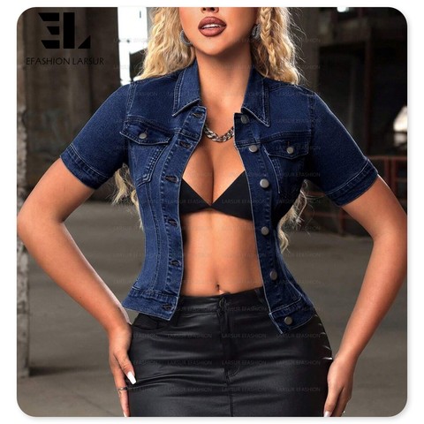 LARSUR Custom factor Wash manga corta Denim jeans jacketskinny slim fit boxy cropped Denim jacket para mujer