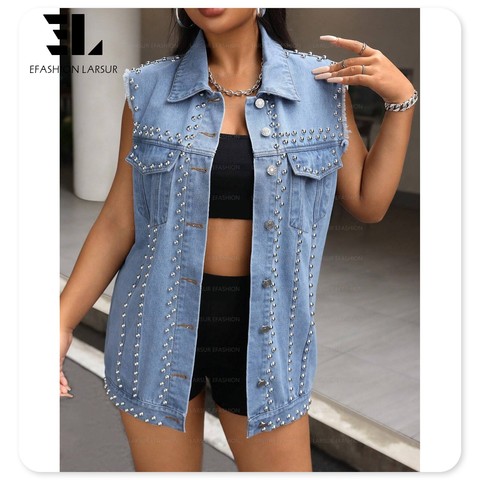 Chaqueta vaquera sin mangas LARSUR de fábrica personalizada, chaleco vaquero rasgado con dobladillo desgastado y tachonado holgado para mujer