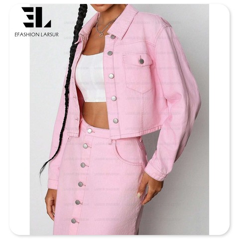 LARSUR-Chaqueta vaquera de sarga de algodón de manga larga para mujer, chaqueta vaquera recortada con botones, pantalones cortos, abrigo para mujer