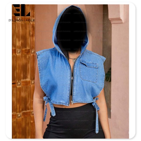 Chaqueta vaquera sin mangas LARSUR personalizada de fábrica con lavado desgastado con cremallera con capucha, chaleco vaquero recortado con mosca para mujer